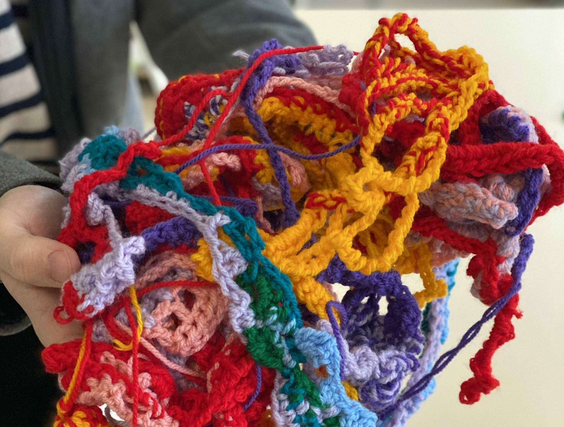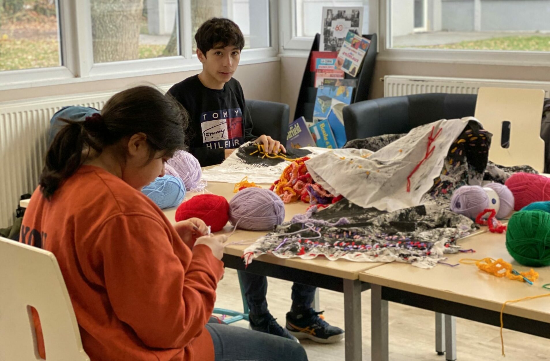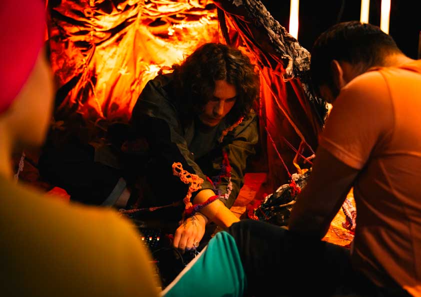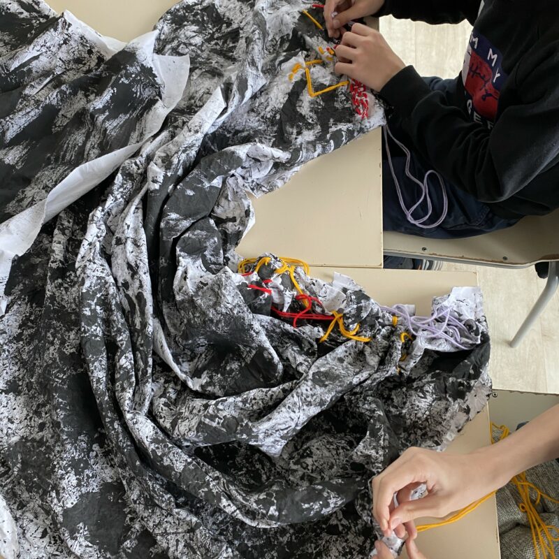Les jeunes du D.A.M.E ont travaillé avec Élodie Derache sur la création plastique d’un décor inspiré des paysages et de leur imaginaire de la mine. Entre novembre 2025 et fin janvier 2026, les jeunes se sont donné•es rendez-vous chaque semaine pour créer une “grotte” textile aux empreintes charbonneuses, brodées de motifs colorés.