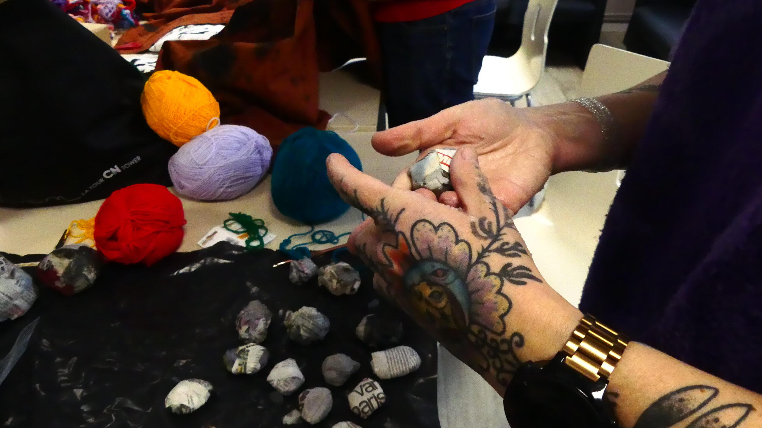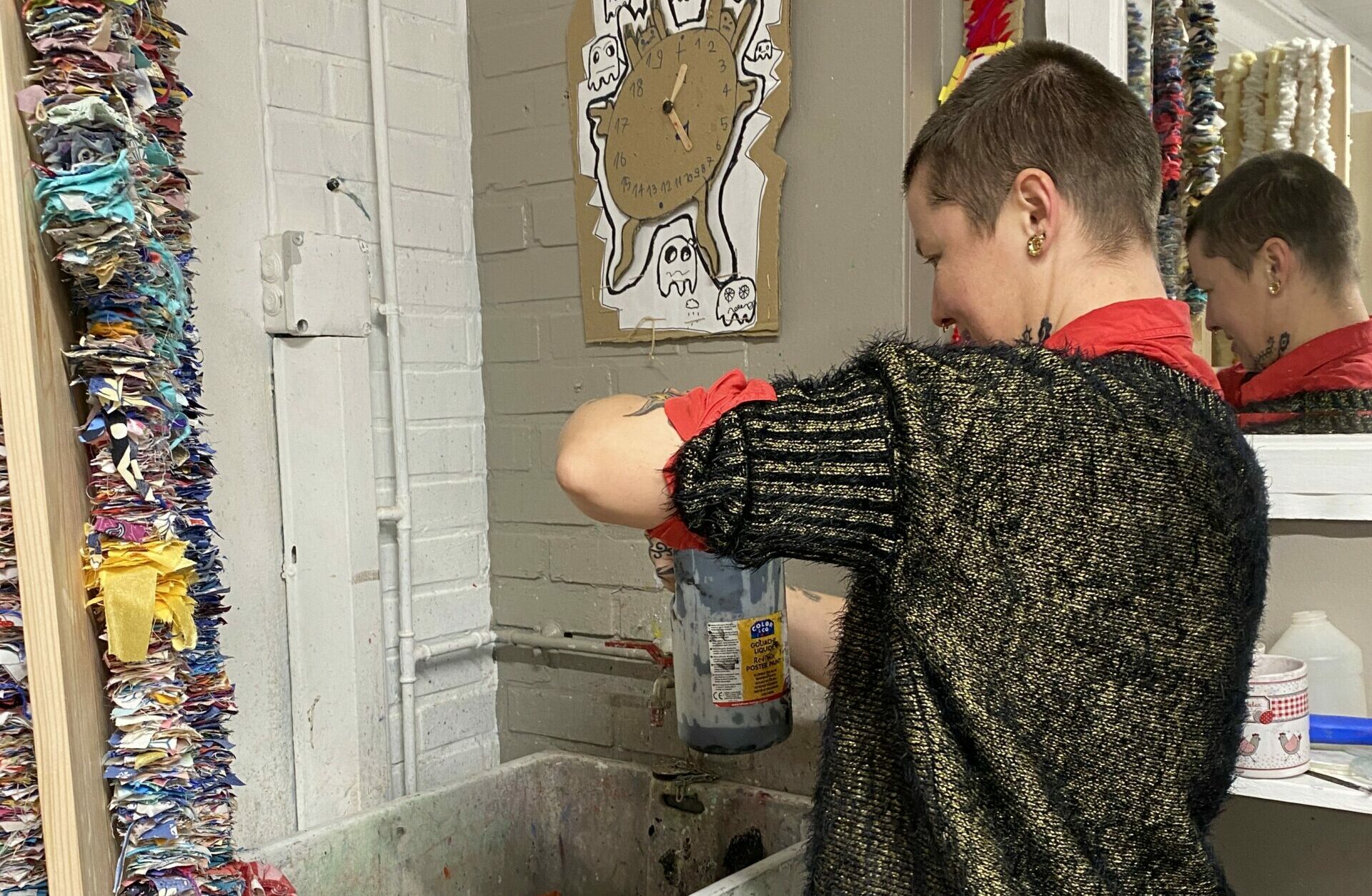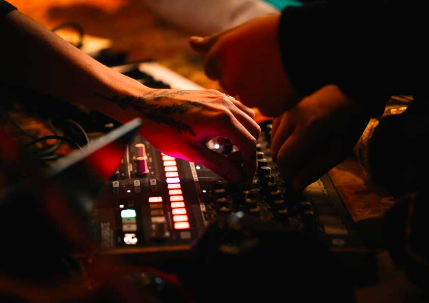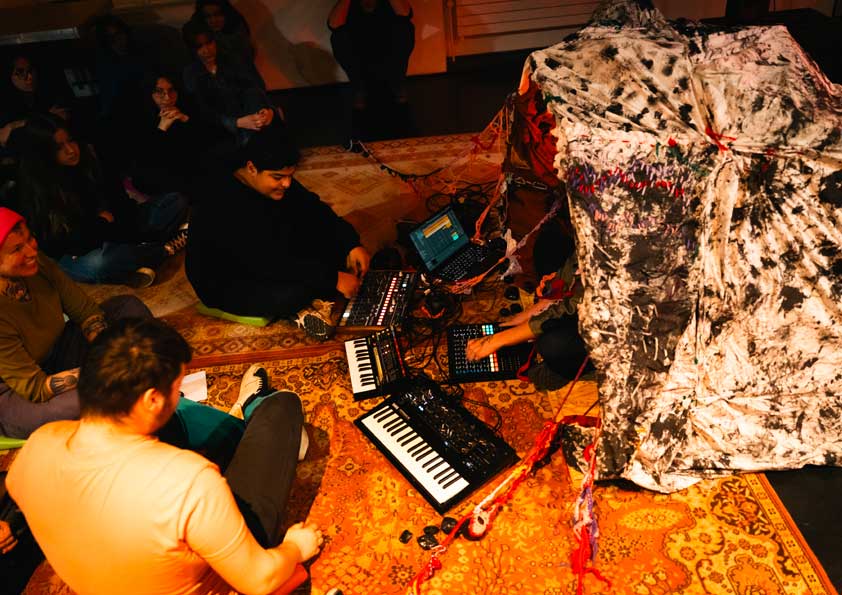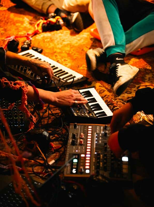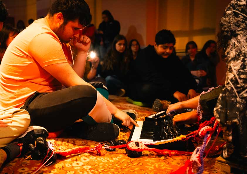 Les équipes artistiques ainsi que les jeunes ont d’abord découvert et visité les ANMT et ont participé à des ateliers de médiation musicale avec les équipes de la Cave aux Poètes. Ensuite, le tempo a été pris et iels se sont rencontré•es tous les lundis pendant des ateliers de pratique artistique autour des univers musicaux et plastiques de Lysten et Elodie Derache. Certains ateliers ont eu lieu au D.A.M.E, d’autres aux ANMT. Enfin, les étudiantes de l’ESAAT ont rejoint le groupe pour quatre rendez-vous aux ANMT autour de la mise en scène des œuvres, mises en lumière et en espace, en lien avec le lieu, la musique et la thématique.