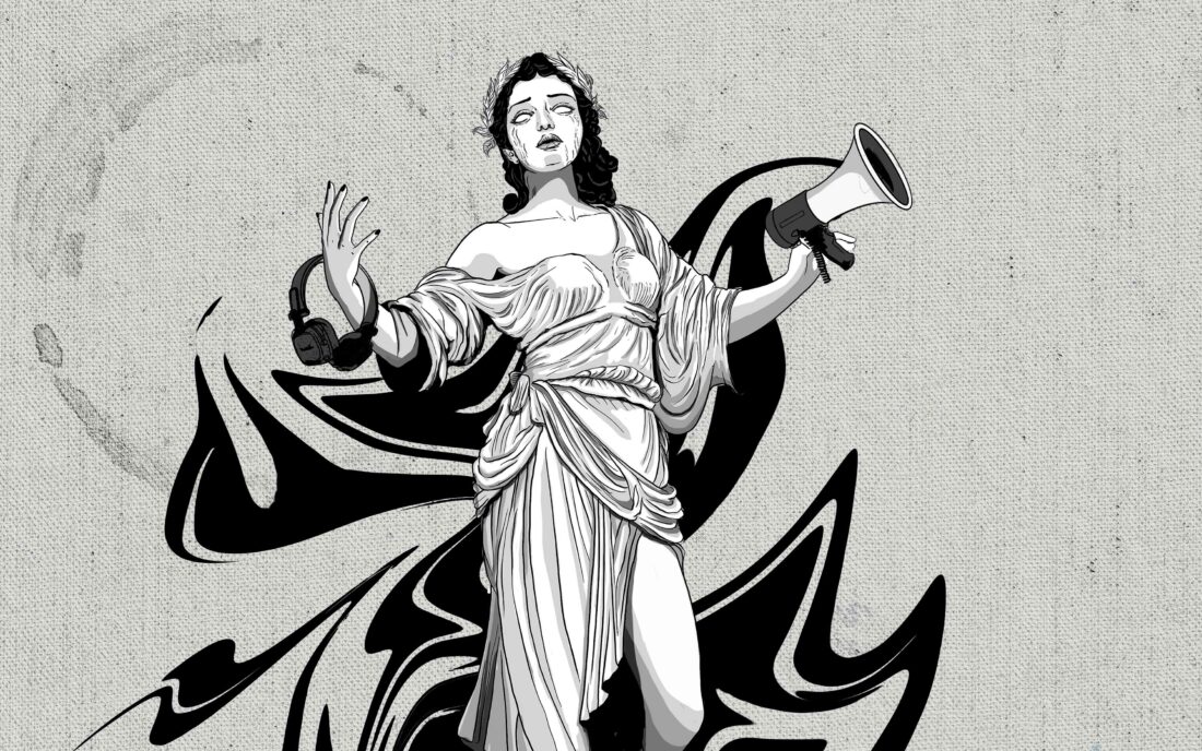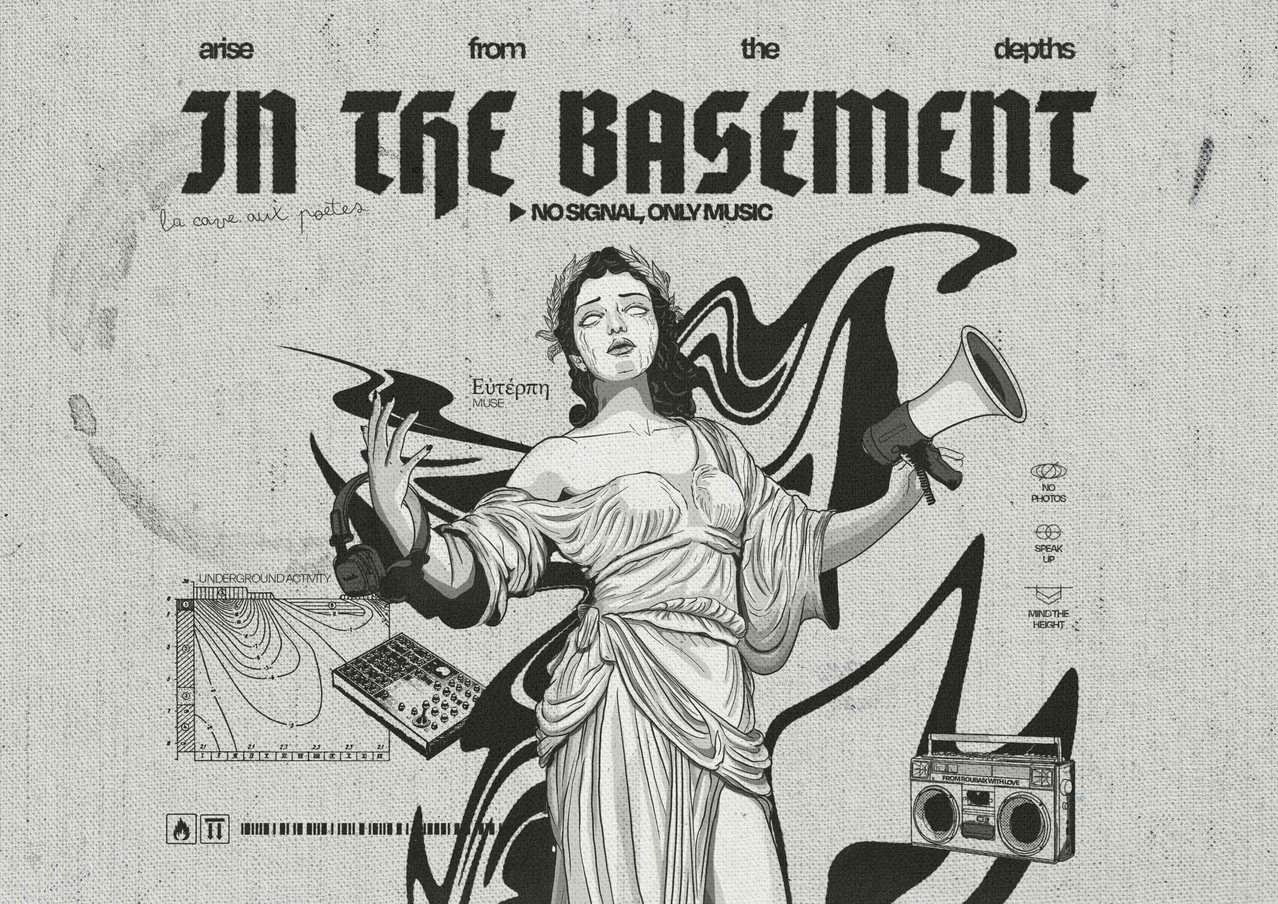 En 2026, la Cave aux Poètes déploie son ADN. Les briques apparentes se fondent au grain du papier. Les fréquences enveloppent la muse. Elle représente tous.tes les artistes, tous les publics, tous.tes celles et ceux qui se retrouvent autour de la musique. La typographie nous rappelle l’ambiance sombre des souterrains, et les affiches de punk-rock, clin d’œil aux fondateur.rices de la Cave aux Poètes.